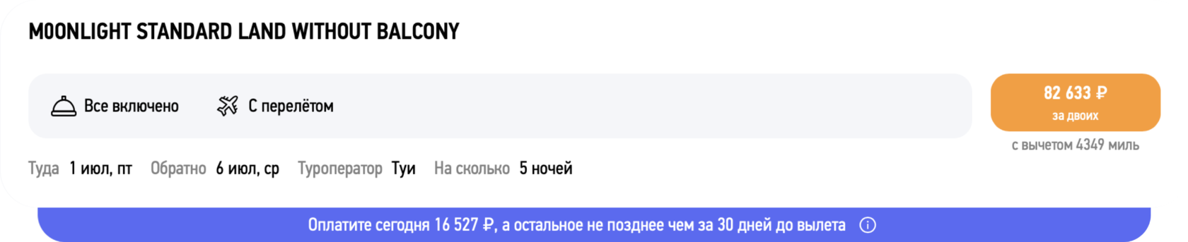 Например, тур на август стоит 150 000₽. Сейчас вы оплачиваете 20 000₽, а оставшиеся 130 000₽ вносите позже сразу или частями до середины июля.